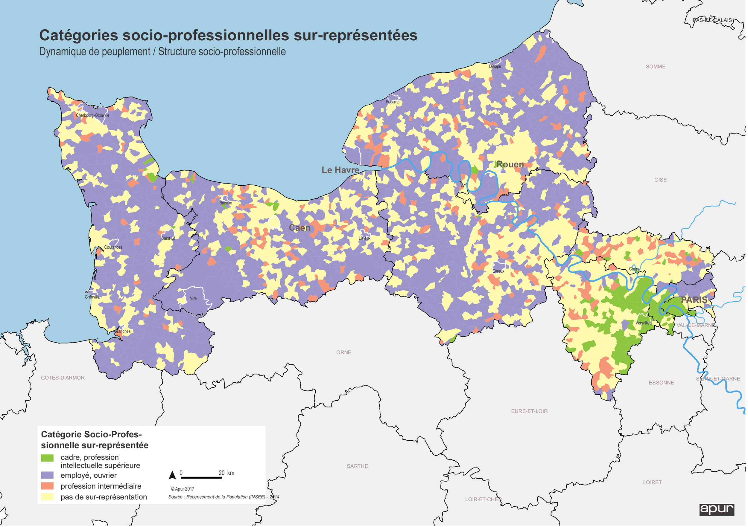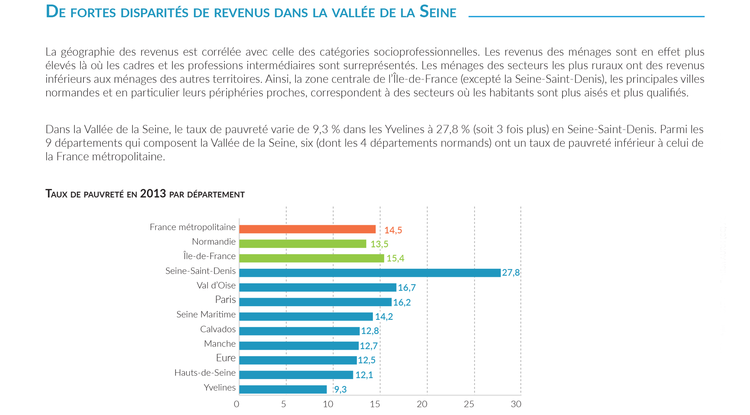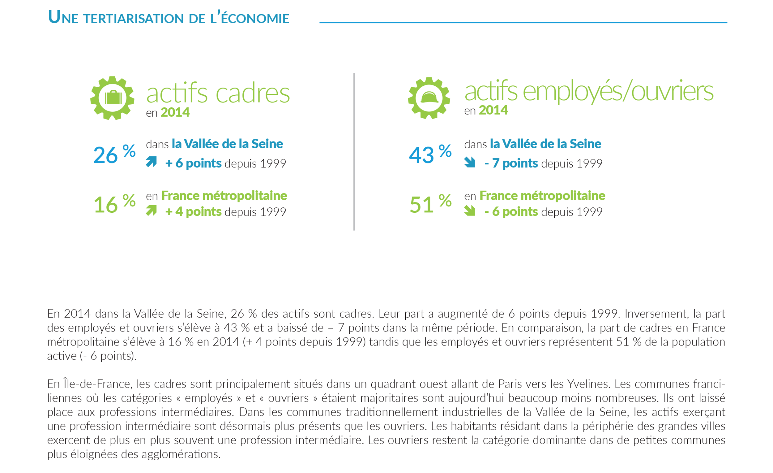 L’analyse des évolutions des catégories socioprofessionnelles met en évidence les profondes mutations qui ont notamment eu lieu sur le territoire de l’Axe Seine suite à la désindustrialisation qui a débuté au milieu des années 1980. La tertiarisation et l’élévation générale des qualifications que requiert désormais l’économie se traduit depuis plusieurs décennies par une progression des « cadres et professions intellectuelles supérieures » et un recul des « ouvriers » et « employés ». Ces évolutions se sont accompagnées globalement par des hausses de revenus mais aussi par un accroissement des disparités particulièrement dans les zones les plus urbanisées.
