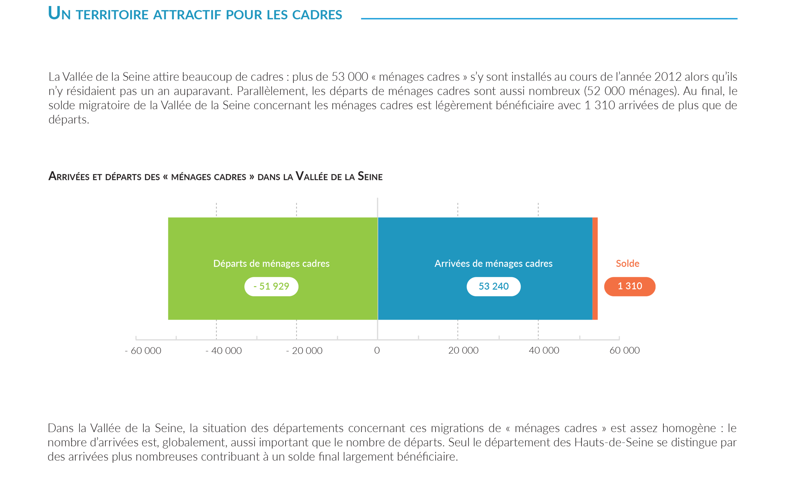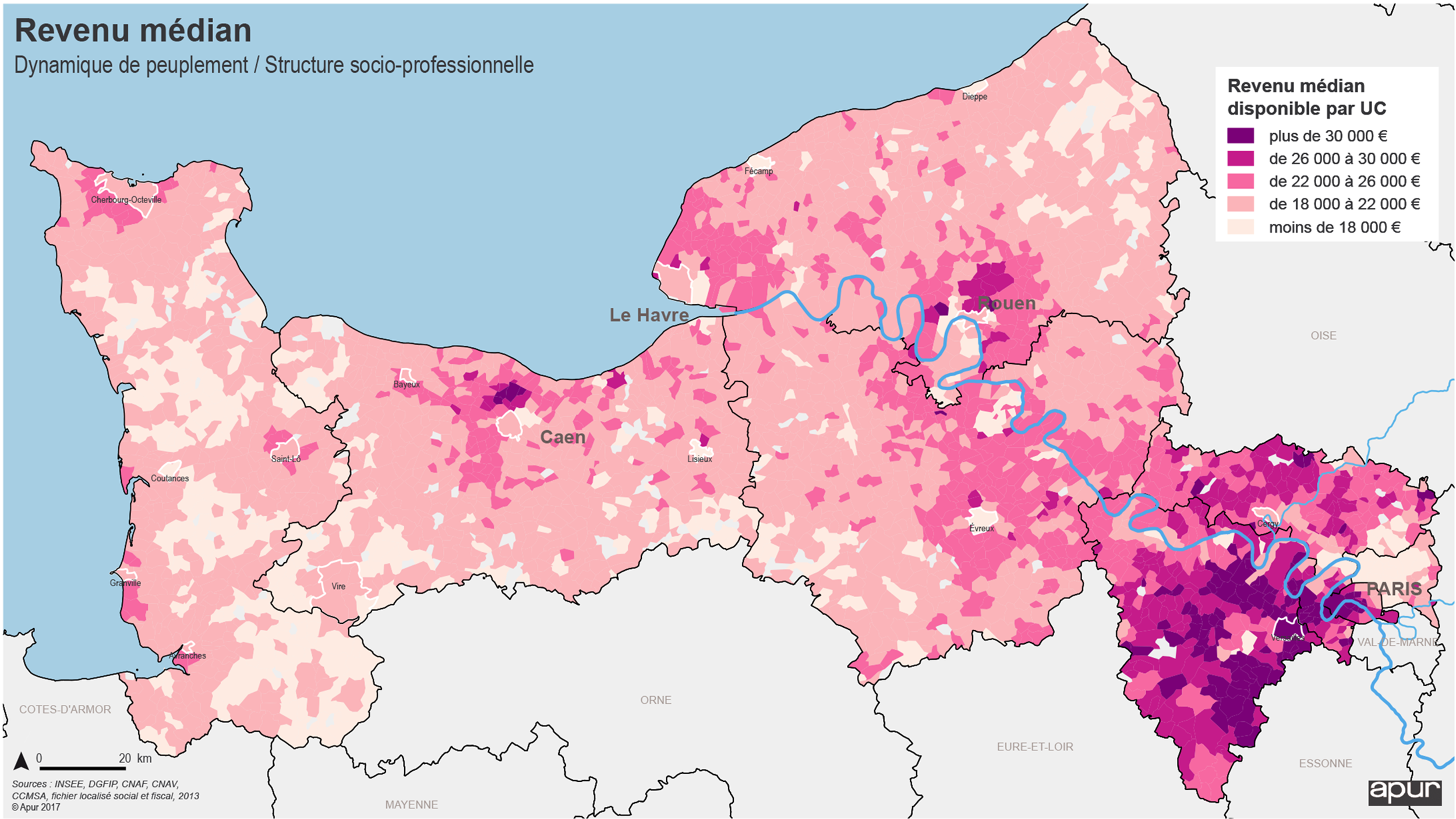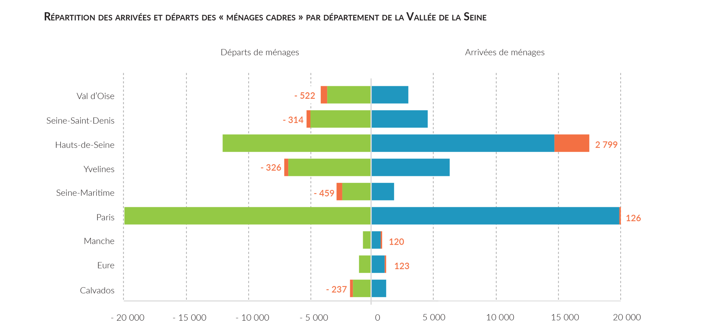 L’analyse des évolutions des catégories socioprofessionnelles met en évidence les profondes mutations qui ont notamment eu lieu sur le territoire de l’Axe Seine suite à la désindustrialisation qui a débuté au milieu des années 1980. La tertiarisation et l’élévation générale des qualifications que requiert désormais l’économie se traduit depuis plusieurs décennies par une progression des « cadres et professions intellectuelles supérieures » et un recul des « ouvriers » et « employés ». Ces évolutions se sont accompagnées globalement par des hausses de revenus mais aussi par un accroissement des disparités particulièrement dans les zones les plus urbanisées.